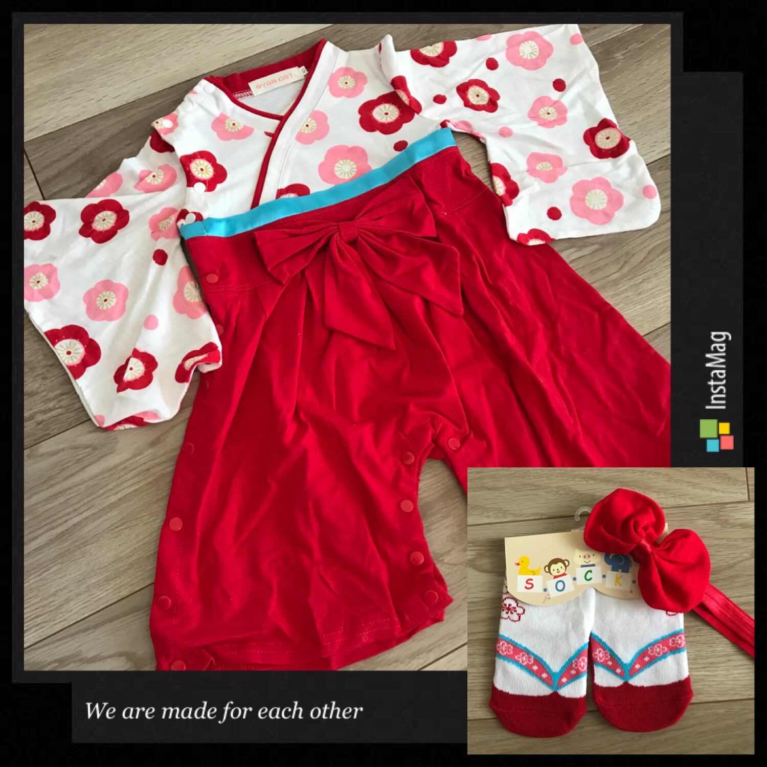 袴ロンパース赤&草履風靴下赤9-12cm&ヘアバンド 女の子