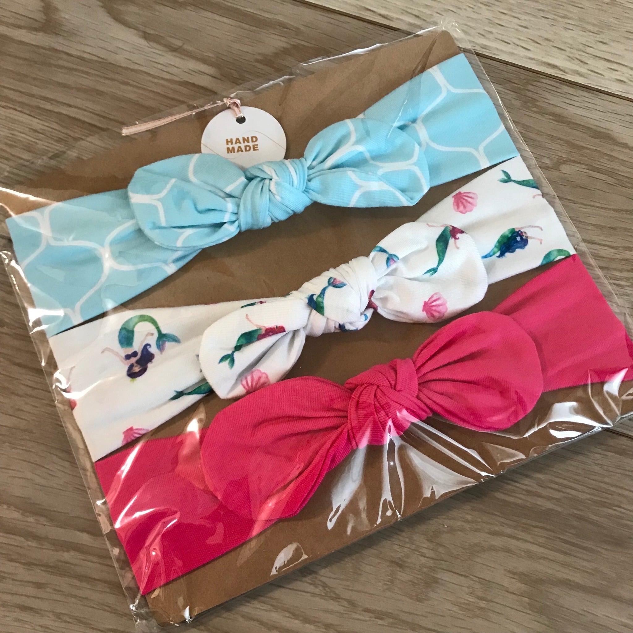 赤ちゃんベビーヘアバンド 水色×ピンク♡マーメイド柄リボン 3点セット